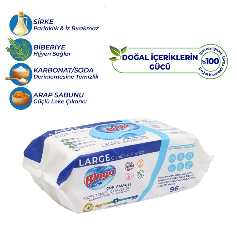 Hijyen koşullarına uygun bir şekilde üretilen ve dermatolojik olarak test edilen bir ürün olan Bingo yüzey temizlik havlularıyla her türlü temizleme işlemini rahatlıkla yapabilirsiniz. Bu sayede cildinize zararlı olmayan içerikler tercih etmiş oluyorsunuz. Ofiste, evinizde ve birçok alanda tercih edebileceğiniz bu temizlik havlusunu; cam, klozet, lavabo, halı, kanepe, elektronik eşya, masa, sandalye ve daha fazla ürün için kullanabilirsiniz.