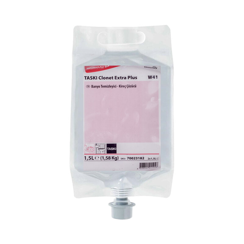 Diversey Taski Clonet Extra Plus W41, asidik yapısıyla musluk, lavabo, duş kabini, klozet ve seramik yüzeylerde derinlemesine temizlik sağlar. Konsantre formülü sayesinde hem temizlik maliyetini düşürür hem de uzun süreli kullanım imkânı sunar. Sadece doğru oranda seyreltilerek kullanıldığında bile maksimum hijyen ve gözle görülür parlaklık sağlar. Ferahlatıcı kokusu ile banyo alanlarında uzun süren temizlik hissi yaratır.