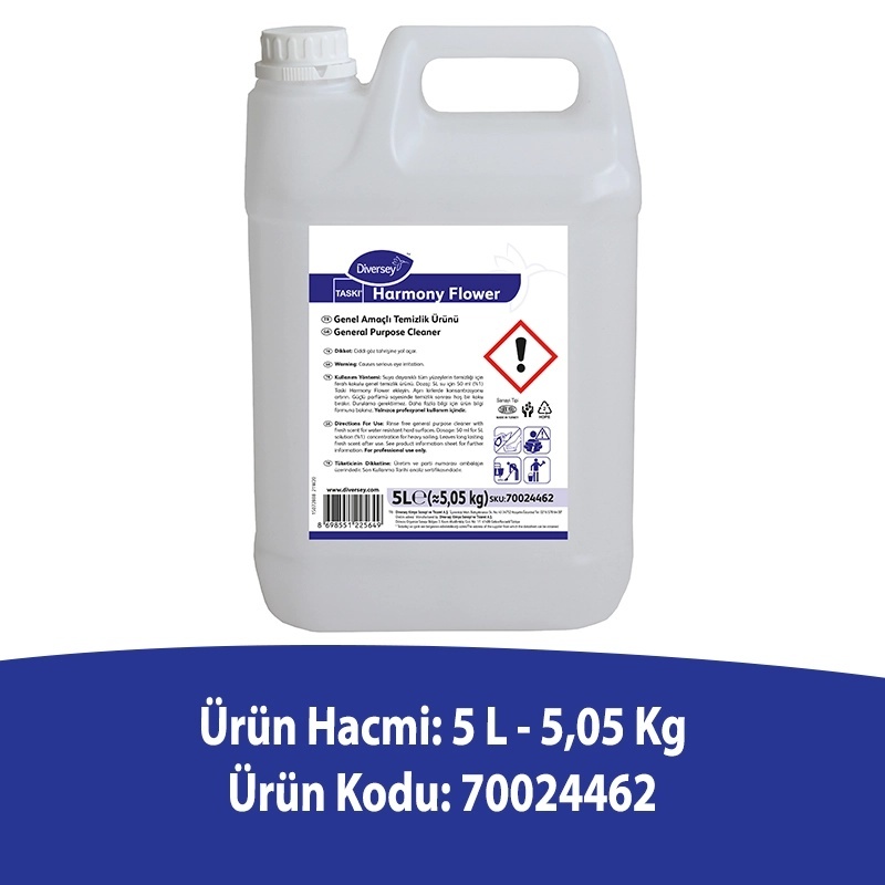 Diversey Taski Harmony Flower Parfümlü Genel Temizlik Maddesi, ev ve işletme temizliği için kullanılan bir üründür. Bu ürün, 5 litrelik bir bidon içinde sunulmaktadır.