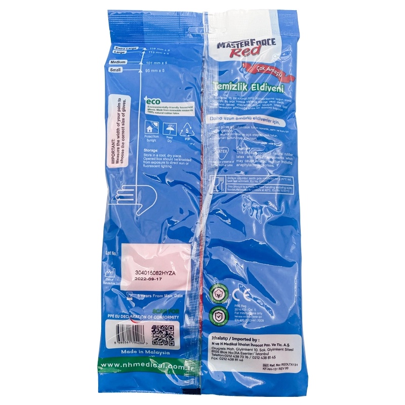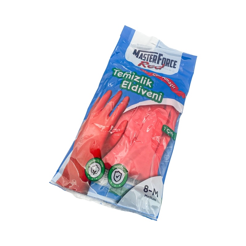 Masterforce Red Çok Amaçlı Temizlik Eldiveni "TS EN 420+A1:2010 standartlarına uygun olarak üretilmiştir. Pamuklu iç yüzeye sahiptir. Haspet Masterforce Temizlik Eldiveni, ev ve işletmelerde kullanılabilecek olan profesyonel bir temizlik eldivenidir. Bu eldiven, yüksek kaliteli malzemeler kullanılarak üretilmiştir ve dayanıklılığı, esnekliği ve rahatlığı ile öne çıkmaktadır. Eldivenin parmakları ve avuç içi bölümleri naylon malzeme ile kaplıdır. Bu malzeme, eldivenin esnekliğini ve hareket kabiliyetini arttırmakta ve kullanıcının temizlik işlemlerini daha rahat yapmasını sağlamaktadır. Ayrıca eldivenin parmak uçları ve avuç içi bölümleri, yumuşak dokunuşlu malzeme ile kaplıdır. Bu sayede eldiven, kullanıcının temizlik işlemleri sırasında ellerini rahat ettirmektedir.