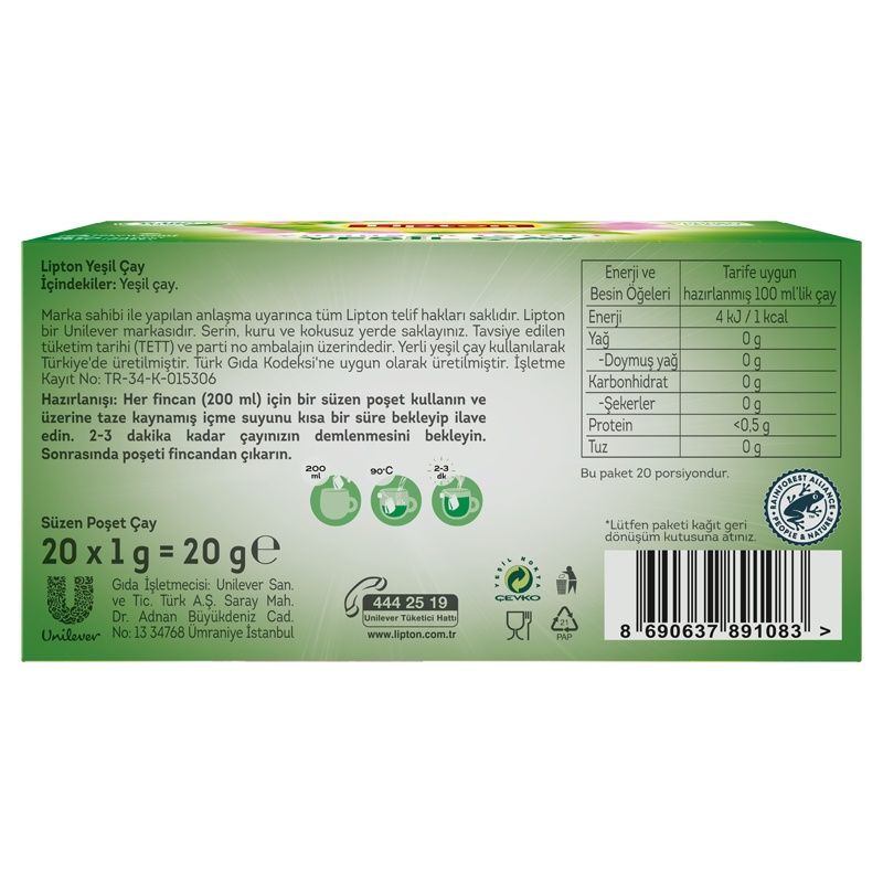 Lipton Yumuşak İçimli Yeşil Çayın. 20 adet süzen bardak poşet çaydan oluşan bu paket, sadece kurutulmuş çay sunar ve kolay ve pratik bir kullanımı vardır. Sadece kaynar su eklenerek ve 3-4 dakika demlenmesi beklenerek hazır hale getirilebilir ve isteğe göre tatlandırılabilir veya sade içilebilir.